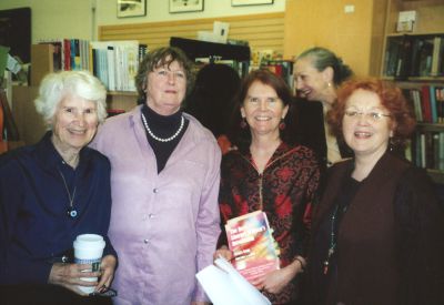 Picture: (Forefront, left to right). Doris Earnshaw, Marsha Hudson, Judy Wells, Bridget Connelly. (In back, right), Naomi Cutner. At Cody's Bookstore, 4th Street, Berkeley, 2005.